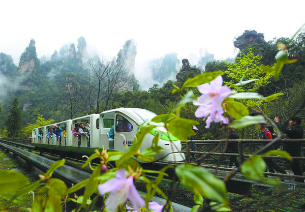 3月25日,游人乘坐观光电车在湖南省张家界市武陵源区十里画廊景区游览。 新华社发