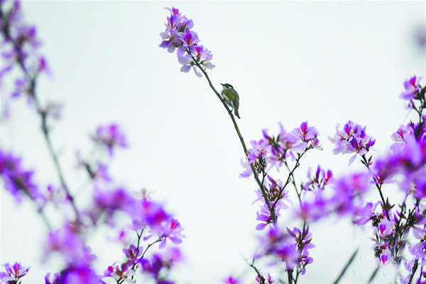 3月24日,在广西柳州市区,一只小鸟在洋紫荆枝头停留。近日,广西柳州市种植的众多洋紫荆开花,市区内花香浮动,春意盎然。 新华社发