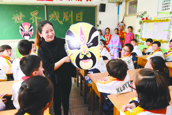 3月27日,在河北石家庄新乐市实验小学,老师教学生认识脸谱。当日是世界戏剧日,各地学校开展戏剧文化进校园活动,让孩子们感受戏剧的魅力。