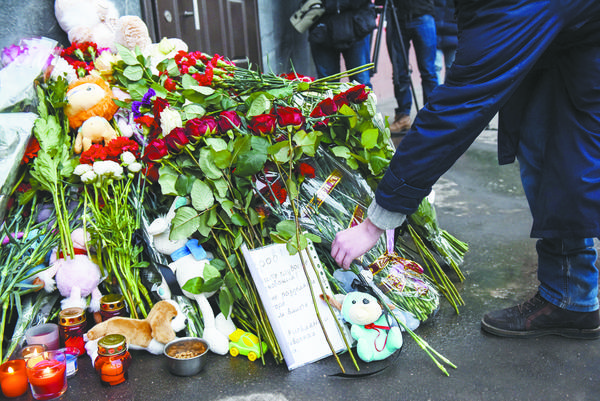 当地时间3月26日,在俄罗斯首都莫斯科,人们在克麦罗沃驻莫斯科代表处门前献花。俄罗斯西伯利亚南部城市克麦罗沃一家购物中心25日发生火灾,据俄紧急情况部26日发布的最新消息,火灾已造成64人死亡,此前在火灾中失踪的人员已被证实大多遇难。据中国驻俄使馆提供的消息,目前暂没有关于中国公民伤亡的报告。