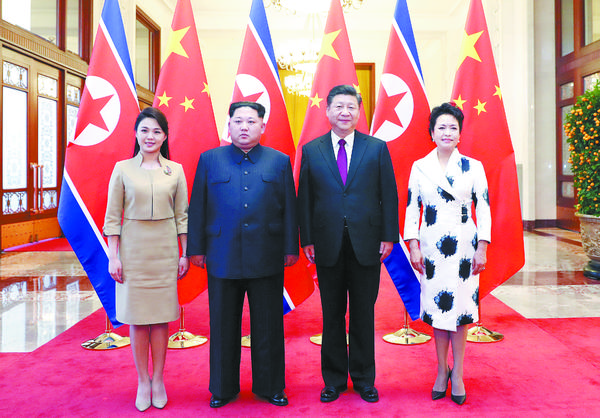 3月25日至28日,应中共中央总书记、国家主席习近平邀请,朝鲜劳动党委员长、国务委员会委员长金正恩对我国进行非正式访问。访问期间,习近平同金正恩举行会谈。这是习近平和夫人彭丽媛在人民大会堂同金正恩和夫人李雪主合影。新华社发