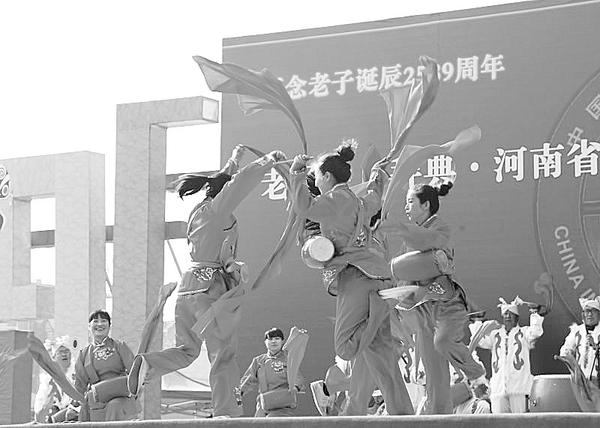 3月31日上午,由省文化厅、周口市人民政府主办,省非物质文化遗产保护中心、市文化广电旅游局、鹿邑县人民政府承办的老子诞辰拜典·河南省非物质文化遗产(传统戏剧)展演系列活动开幕式在老子故里鹿邑县太清宫镇老子文化广场举行,1500余人出席开幕式。图为开幕式上演出的国家级非遗项目——陕西《安塞腰鼓》。 记者 李瑞才 通讯员 胡洪涛 摄