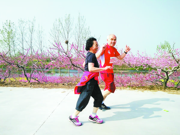当日9时15分,随着发令枪响,众选手健步如飞,在绿色田野和花海中畅跑,与大自然共赴一场春天的约会。71岁的刘书运、汪金凤是参加本次活动中年龄最大的两位选手(如图),当他们并肩跑到终点时,围观群众纷纷伸出大拇指点赞。“沿途都是盛开的桃花,我们老两口一边比赛一边欣赏美景,非常开心。”汪金凤说。