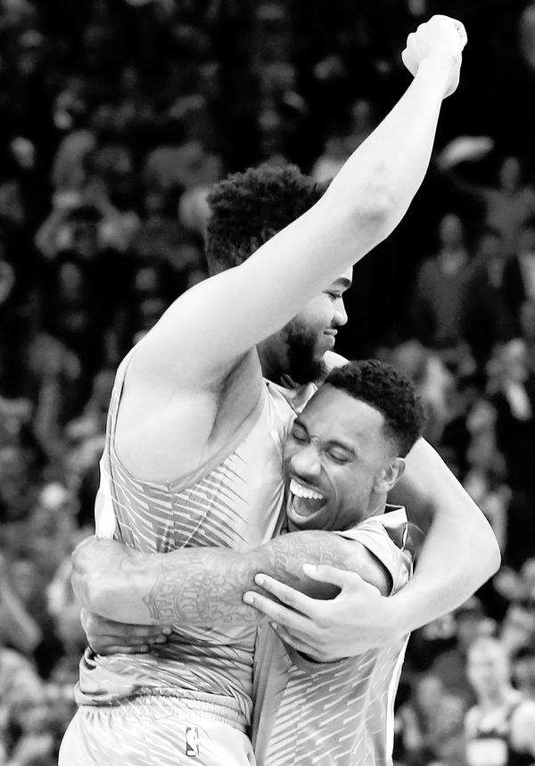 图为当日森林狼队球员唐斯(右)和蒂格在赛后庆祝。