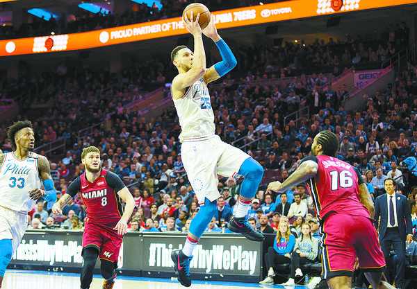 图为76人队球员西蒙斯(上)在比赛中投篮。