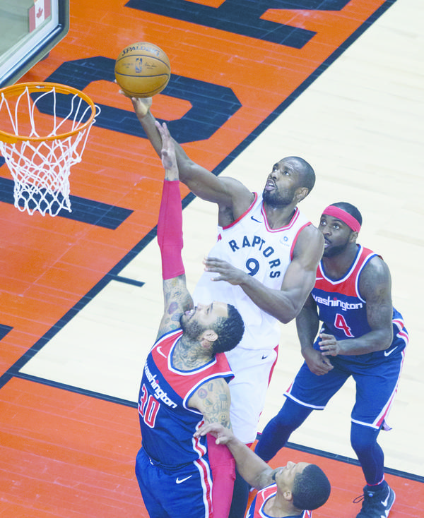 4月17日,在2017—2018赛季NBA季后赛第二场比赛中,多伦多猛龙队主场以130∶119战胜华盛顿奇才队,总比分2∶0暂时领先。 图为当日猛龙队球员赛尔吉·伊巴卡(中)在比赛中上篮。 新华社 发