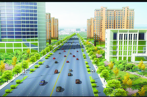 建设大道(大庆路至周口大道)全长2440米,其中跨洼冲沟桥由水系改造项目建设人员负责实施,道路红线宽度50米,建设内容包括绿化、道路、给排水、照明、人行道、交叉口渠化、原有排水管道清淤加固、旧道路拆除、强弱电入地等。