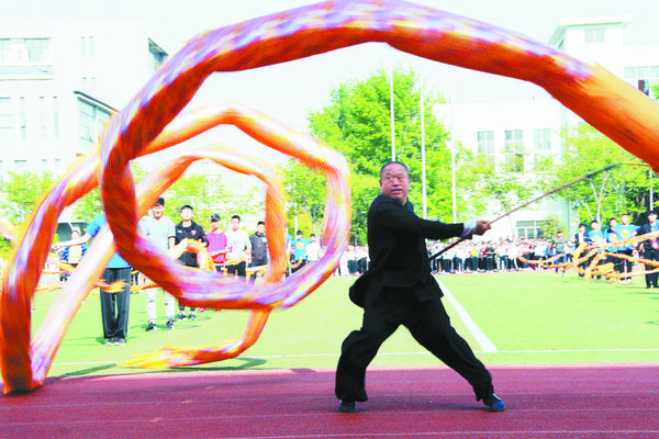 张德全,今年53岁,周口市人,是“武龙太极”德全六艺学院创始人,周口师范学院体育学院特聘导师,还是4所学校的名誉校长、 13所学校的客座教授。他以弘扬中华武术、彰显中国龙之精神为中心,打造特色武术大课间,建立体育艺术化教育模式。图为昨日张德全在周口师范学院表演“武龙太极”。通讯员 葛英 摄