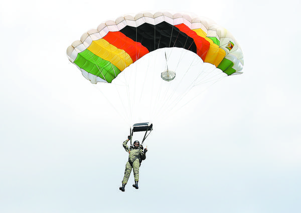 当地时间4月18日,在津巴布韦首都哈拉雷的国家体育场举行的独立日庆祝活动上,一名空军士兵进行跳伞表演。当日,津巴布韦在首都哈拉雷的国家体育场举行活动,庆祝独立38周年。