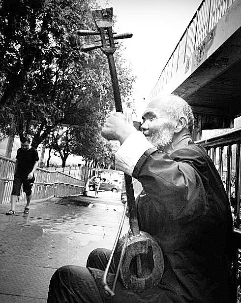 一把坠胡、一个小马扎和一个装钱的小桶,几样简易的物件置于眼前。那清瘦的老人端坐于街头,闭目专心演奏,粗糙的手指灵活地拨动着简单的几根弦,和着曲调,他的头部不时扭动,右脚也不时打着节拍。