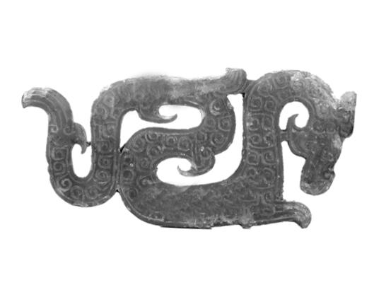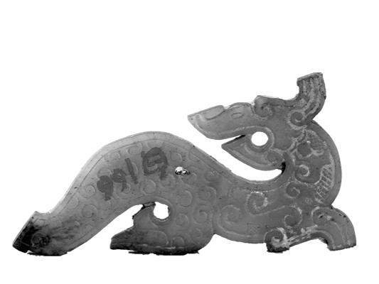 战国镂雕龙形青玉佩。1983年,淮阳县公安局从大连乡盗墓群众家中查获,后移交县文管所,1985年县文管所撤销,移交县博物馆收藏。该器物通长9.8厘米,宽4.4厘米,厚0.2厘米。体呈平板状,昂首,躬身,翘尾,透雕龙体,后身呈折叠状,龙身饰卷云纹,青玉质地。