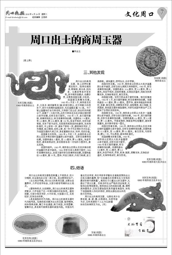 周口出土的商周玉器,除上述两处重要发现外,陆续在淮阳县、郸城县、商水县、扶沟县、太康县等县亦有发现。其中淮阳县最多,也最珍贵,主要是战国玉器,分别是: