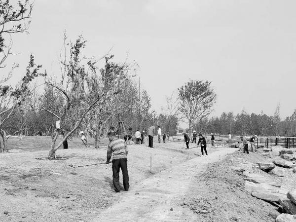 当日11时许,记者在河南建业绿色基地项目施工现场看到,工人们有的在铺设行道砖,有的在栽种草坪,有的在栽植树木,还有一些工人正在温室里忙着苗床组装……