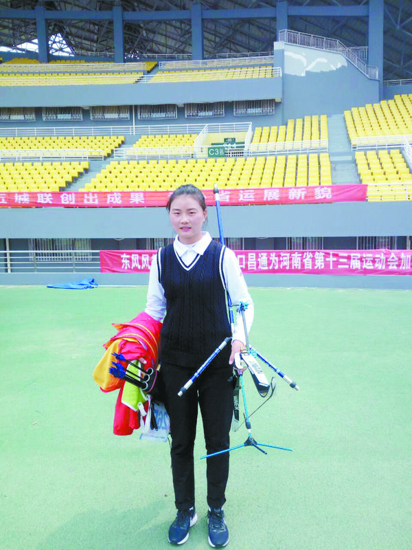 周口选手许景景(如图)继4月24日在省十三运会射箭项目女子甲组个人单轮全能排名赛上获得一块银牌后,又于4月25日上午在射箭项目女子甲组个人赛中夺得一枚金牌。