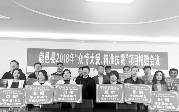 本报讯 4月26日上午,2018年“众情大爱、精准扶贫”项目捐赠仪式在鹿邑县举行。该项目主办方向鹿邑县捐赠1000台家用净水设备。来自该县24个乡镇(办事处)的1000户贫困家庭很快就可以喝到更加安全的饮用水了。