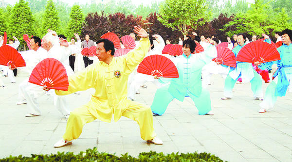 张建国,今年65岁,周口市太极拳协会会长,国家一级裁判,国家级社会体育指导员。他经常义务教授太极拳和组织太极拳活动,为周口太极拳的普及作出了很大贡献。2001年,他参加了国家体育总局在三亚举办的首届世界太极拳健身大赛,荣获太极拳、太极剑双项一等奖;2016年,他在全省老年太极拳比赛中获得太极枪第一名。图为身着黄色健身服的张建国在周口公园教大家练太极扇。通讯员 葛英 摄