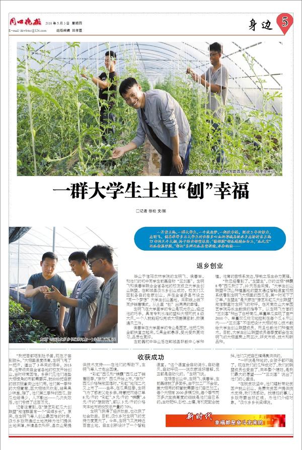一片黄土地、一群大学生、一个农业梦、一起追幸福。经过3年的努力,左明飞、侯善举等多名大学生付出很多心血的郸城县汲水乡左桥村东占地17亩的几个大棚,终于结出甜蜜果实:“豫甜脆”甜瓜通透如白玉,“瓜之宝”西瓜金瓤沙脆,“彩虹”系列西瓜晶莹剔透、水分饱满……