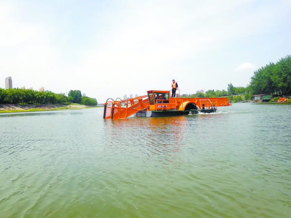 当日上午,记者在沙颍河(大庆路桥至八一大道桥)岸边看到,水面垃圾清理船正在作业(如图)。船上共有两名工作人员,一人负责驾驶船只,另一人则负责观察周围情况。当船只靠近水草时,船头前的大型刀片落下将水草割断,传送带把割断的水草送至船体储藏处。待船体储藏处饱和后,水面垃圾清理船把水草运回岸边。