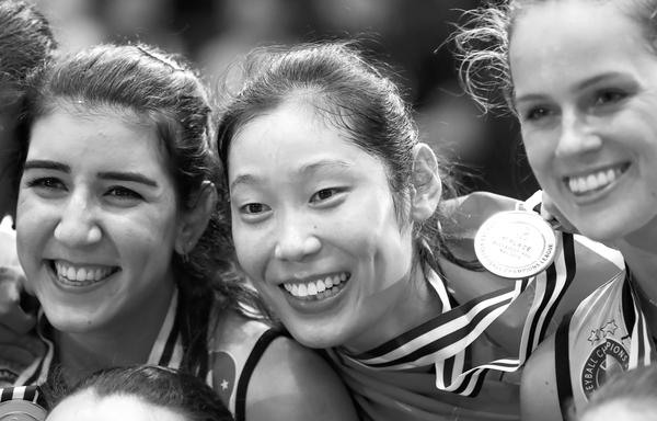 图为瓦基弗银行队球员朱婷(中)与队友在比赛后合影。