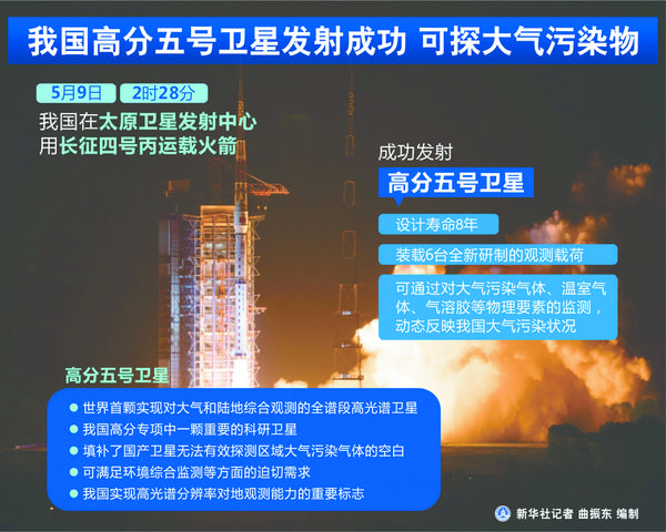 新华社太原5月9日电(记者 白国龙 余晓洁)5月9日2时28分,我国在太原卫星发射中心用长征四号丙运载火箭成功发射高分五号卫星。