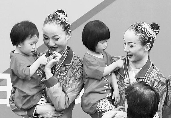 图1为2017年5月17日,在天津举行的第13届全运会花样游泳双人项目比赛后,四川队选手蒋婷婷、蒋文文抱着孩子出席颁奖仪式,孩子们同时竖起大拇指为妈妈点赞。