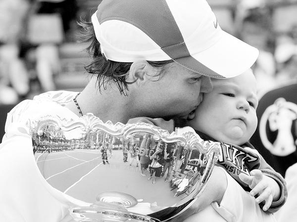 图2为2008年1月5日,在新西兰举行的奥克兰网球精英赛女子单打决赛后,获冠军的美国选手达文波特领奖后亲吻儿子。