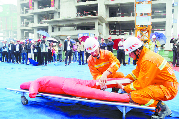 5月11日上午,商水县建筑施工现场应急救援演练在该县一建筑工地举行。200多人冒雨参加演练。据悉,此次演练由商水县住建局和安监局主办。通过此次演练,增强了大家的安全意识,提高了对突发事件的应变能力和在发生意外伤害事故时员工的自救、自护能力,最大限度地减少或避免意外伤害事故造成的损失。图为高空坠落救援演练。