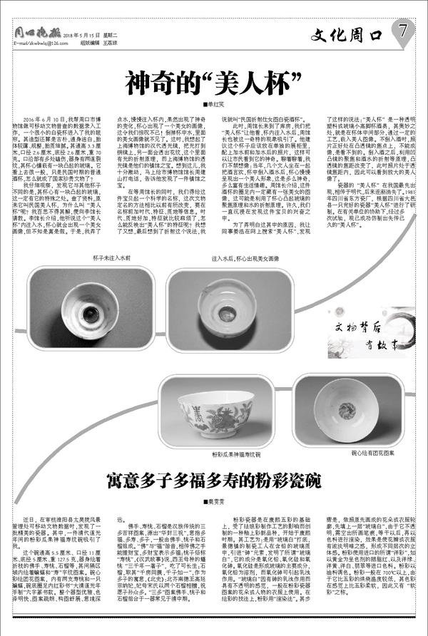 我仔细观察,发现它与其他杯子不同的是,其杯心有一块凸起的玻璃,这一定有它的特殊之处。查了资料,原来它叫民国美人杯,为什么叫“美人杯”呢?我百思不得其解,便向李馆长请教。李馆长介绍,他听说这个“美人杯”内注入水,杯心就会出现一个美女画像,但不知是真是假。于是,我弄了点水,慢慢注入杯内,果然出现了神奇的变化,杯心出现了一个美女的画像,这令我们惊叹不已!倒掉杯中水,里面的美女画像就不见了。这时,我想起了上海博物馆的汉代透光镜,把光打到铜镜上,另一面会透出花纹,这个里面有光的折射原理,而上海博物馆的透光镜是他们的镇馆之宝。想到这儿,我十分激动,马上给市博物馆馆长周建山打电话,告诉他发现了一件镇馆之宝。