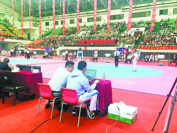 在跆拳道比赛中,选手之间攻防转换迅速,当比分陷入胶着时,每一分都十分关键,裁判的判罚有时候会引起选手、教练的异议。因此,当场边的教练对场上裁判的判罚有异议时,可以向负责录像审议的裁判申请视频回放,这样通过慢镜头回放,可以保证场上的判罚公正。图为裁判正在查看视频回放。