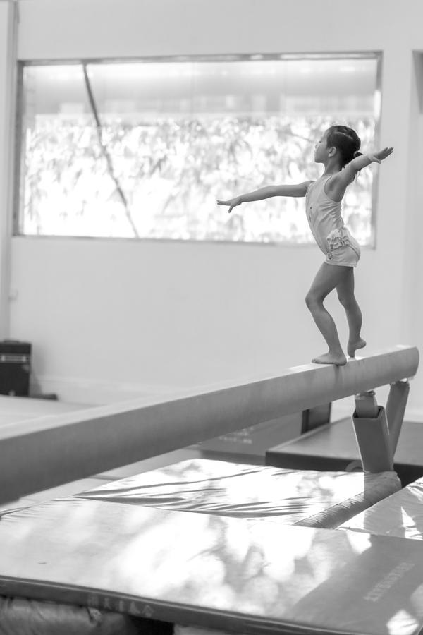图3为小学员徐子涵在榕江县少年儿童业余体操运动学校内进行平衡木训练。