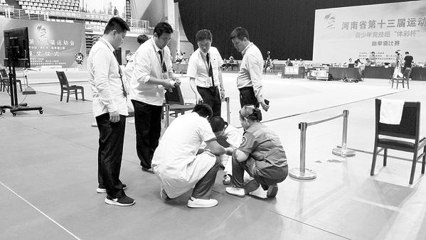 5月17日,在省十三运会青少年竞技组跆拳道比赛中,郑州选手突然倒地且表情十分痛苦。医护人员入场检查后,认为该选手不适宜继续比赛。随后,裁判终止比赛。图为医护人员为倒地运动员检查。记者 牛思光 摄