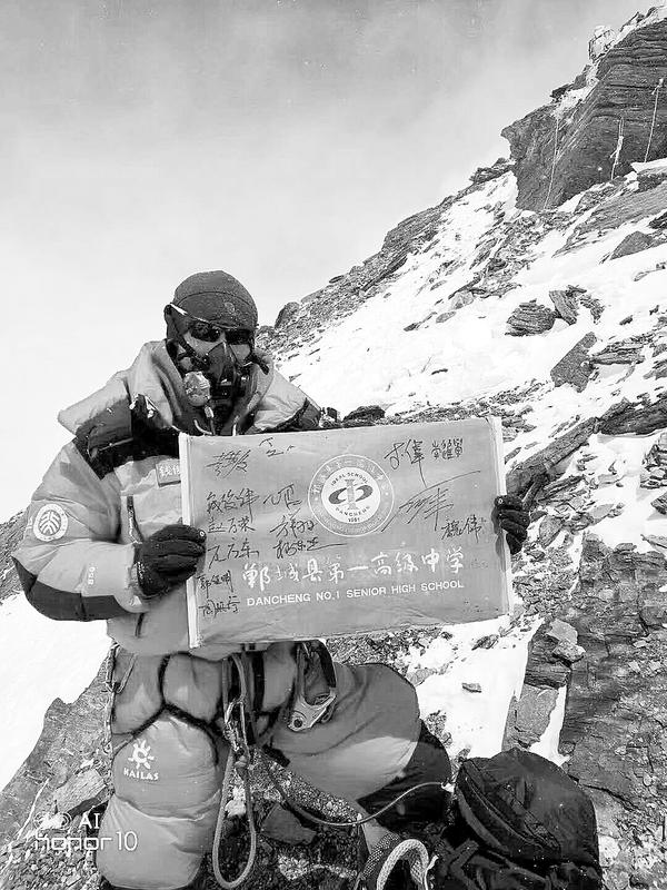 一路上,钱俊伟带着由全体珠峰登山队队员签名的郸城一高校旗,并在不同的海拔高度与校旗合影,留下珍贵画面。