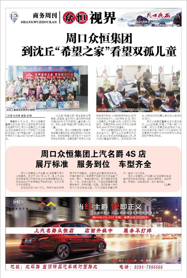 本报讯 5月15日,周口众恒集团董事长王文涛、周口众恒新能源汽车城总经理司巧巧、周口众恒集团上汽名爵4S店总经理田长江一行来到了沈丘县新区实验小学“希望之家”,为这里的孩子带来了价值4000元的学习及生活用品。