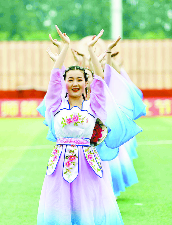 右图为安徽亳州幼儿师范学校学生在文化节上表演节目。