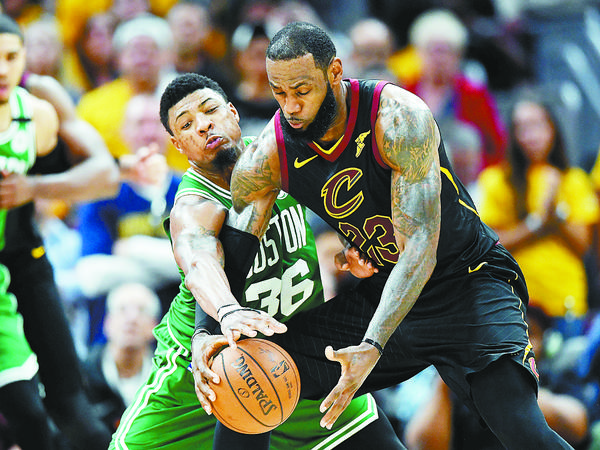 图为骑士队球员詹姆斯(右)在比赛中与凯尔特人队球员斯玛特拼抢。