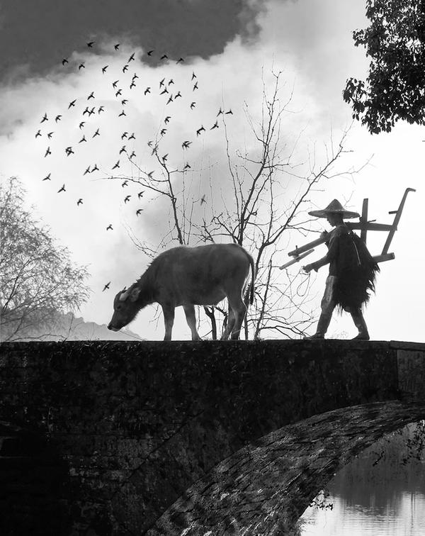 听到哞的一声牛叫,石头的眼倏然瞪圆了。他吃力地坐起来,瞪视着黄牛的照片,往事像放电影一样纷至沓来——春日阳坡上啃草的是牛,夏日树荫下纳凉的是牛,秋日田野里拉犁的是牛,冬日大路上负重的是牛。牛吃的是草,出的是苦力,春种秋收里有它疲惫的身影,五谷丰登里饱含着它的血汗,可以说牛是乡村的一道风景,一道最美的风景。没想到这风景说消失就消失了,三村五里再也见不到牛的影子了。