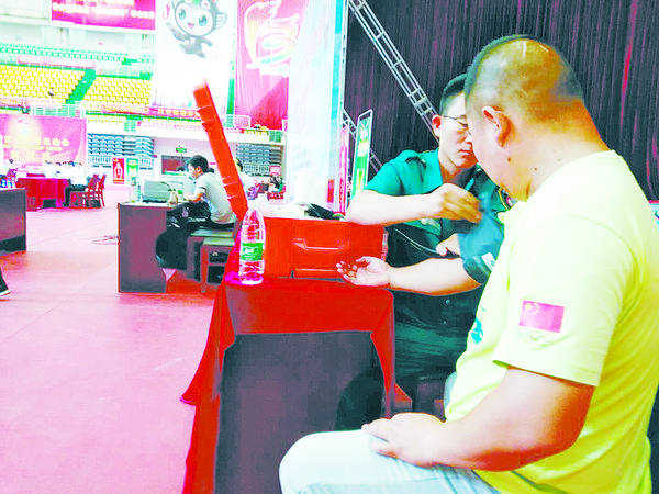 5月28日下午,在省十三运会青少年竞技组拳击比赛现场,医务工作者为参加比赛的教练员测量血压(如图)。据悉,为确保比赛顺利进行,赛场设立了医务监督台,不仅配备有专业的医疗器械,还选派了经验丰富的医务工作者,为参赛人员提供强有力的医疗保障。