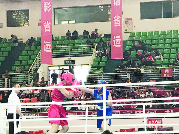 当日13时,比赛在周口市体育中心体育馆举行,周口选手王霄萌一上场,现场观众就开始为她呐喊助威。王霄萌的对手是郑州队的倪博雅,两人一上来就摆开对攻的架势,激烈的比赛引得现场观众不断喝彩。在第一回合比赛中,王霄萌率先发力,一记重拳打向对手头部,对手成功躲避后顺势反击,相当精彩。