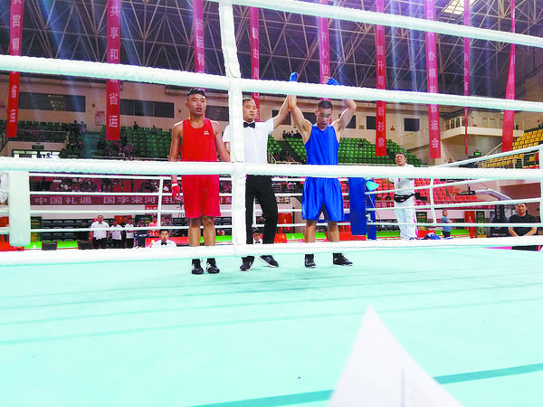 5月29日,在省十三运会青少年竞技组男子甲组69公斤级1/2决赛中,周口选手刘小明(蓝方)战胜驻马店选手张志万,顺利晋级决赛。 记者 韩志刚 摄