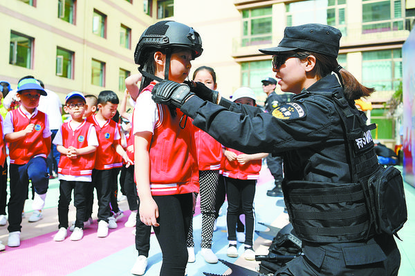 5月29日,兰州市城关区和政路幼儿园的小朋友现场体验警用装备。当日,为迎接即将到来的“六一”国际儿童节,兰州铁路公安处特警支队在兰州市城关区和政路幼儿园开展“小手拉大手”平安课堂活动。特警队员为孩子们讲解了危险求救和安全防范知识,并现场展示了警用装备的使用方法,帮助孩子们提高自我保护能力。 新华社记者 陈斌 摄
