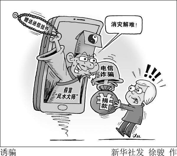 该团伙在实施犯罪时,先由一线“话务员”以赠送迷信挂件为诱饵,将获取的客户信息转交二线“话务员”;二线“话务员”假冒“风水大师”,以卖开光摆件和挂件方式进行诈骗;接下来再由同组“话务员”假冒“风水大师”的师傅或修行更深的高僧,以“消灾解难”为由让客户向指定账号捐款,继续实施诈骗活动。新华社发 徐骏 作