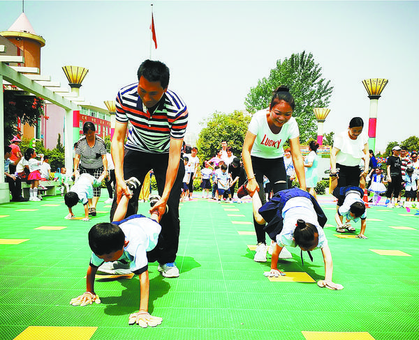 5月31日上午,周口市市直幼儿园文昌分园举办了盛大的庆“六一”亲子趣味运动会,孩子们和家长一块玩起了滚铁环、推小车、夹球蹦等游戏,欢声笑语溢满校园。