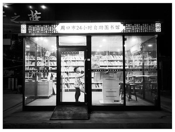 5月31日20时30分许,一个男孩准备离开周口市24小时自助图书馆。