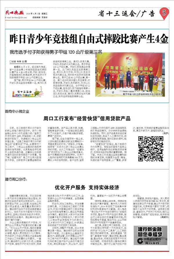 本报讯 6月4日,经过激烈角逐,省十三运会青少年竞技组自由式摔跤比赛产生4金4银8铜,开封、驻马店、许昌等竞技队获得奖牌,我市选手付子阳获得男子甲组120公斤级第三名。