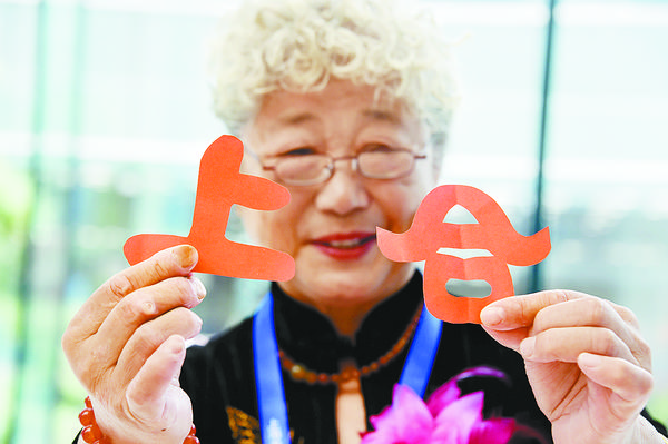 66岁的中国剪纸艺术大师李文玲在展示她剪出的“上合”(6月6日摄)。上合青岛峰会新闻中心专门设立了文化展演区,峰会期间,琴箫合奏、琵琶独奏、古筝齐奏等民乐演奏将循环进行。此外,山东剪纸、菏泽面塑、崂山茶艺等多种齐鲁非遗文化展示在为新闻中心增添更多文化色彩的同时,也向境内外媒体呈现出中华传统文化的独有魅力。