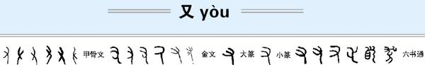 “又”字在六书中属象形字,其甲骨文写作“ ”,就像一只手:向左上方伸展的三个笔画表示手指头,向右下方伸展的一长笔表示手臂;金文写作“ ”,就更像一只右手了,还是三个指头向左上方伸展;小篆写作“ ”,也是三个指头向左的一只右手。甲、金、篆三种写法外形基本相像,都像一只右手,故“又”字的本义为右手。“又”是“右”的本字,“右”是“又”的后起字。三种字形中的三个分叉都是代表人的手指。古代一般用“三”表示多数,这里的“三”代表人的右手五个指头。