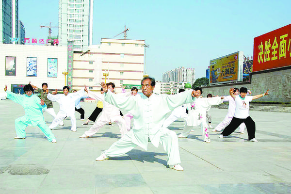 马义炯 ,74岁,周口市太极拳协会副会长,国家级社会体育指导员,武术荣誉一级裁判员、一级拳师,河南省优秀武术辅导员、社会体育指导员。他常年从事太极拳的推广和普及工作,自1994年至今,举办太极拳培训班380多期,累计培训学员1.6万多人次。图为马义炯(前排中)在教学生打太极拳。