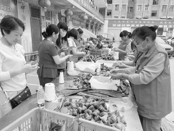 6月18日是端午节。当日,太康县爱心早餐志愿者在爱心粥屋外,为环卫工人包粽子。