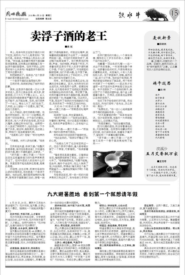 早上,母亲与我正在院子里的大树下吃饭,突然问:“今个儿是周末吗?”我说不是。母亲说:“那等会儿我买点儿浮子酒。”我知道,母亲喜欢用浮子酒当酵母发面蒸馍,这样蒸出的馍既暄又有一丝浮子酒的甜香味。但我不明白,这和周末有什么关系吗?难道卖浮子酒的到了周末还要休息?