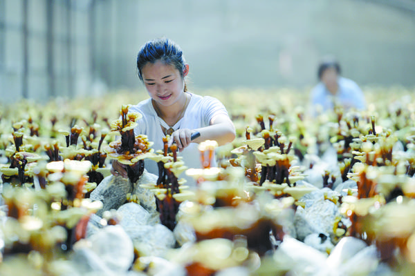 6月20日,广宗县大柏社村农民在温室大棚修剪灵芝。 近年来,河北省广宗县大柏社村积极引导农民结合市场需求调整农业产业结构,采取“公司+合作社+基地+农户”的经营模式,发展特色灵芝种植,并开发出灵芝盆景、灵芝孢子粉等相关衍生产品,开辟出一条富农创收新路径。目前,大柏社村灵芝种植面积近百亩,种植各类灵芝5000余株,带动120余名农民就业增收。